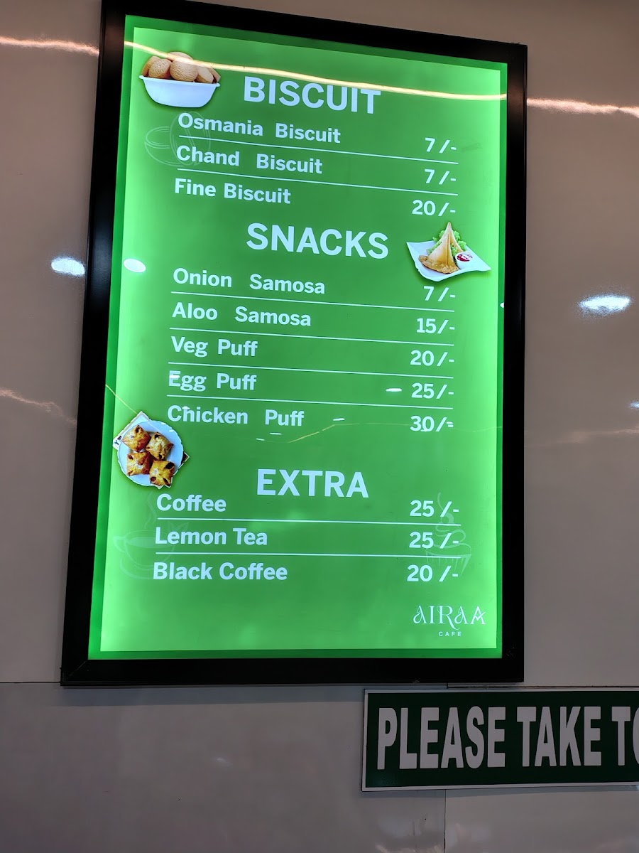 Beyond their famous chai and Bun Maska, Airaa Cafe also offers a variety of beverages, including refreshing Lemon Tea and classic coffee, all priced at ₹179.00, as well as an assortment of delicious biscuits that are perfect for snacking. From traditional Osmania Biscuits to crunchy Salt Biscuits, there’s something to satisfy every palate.